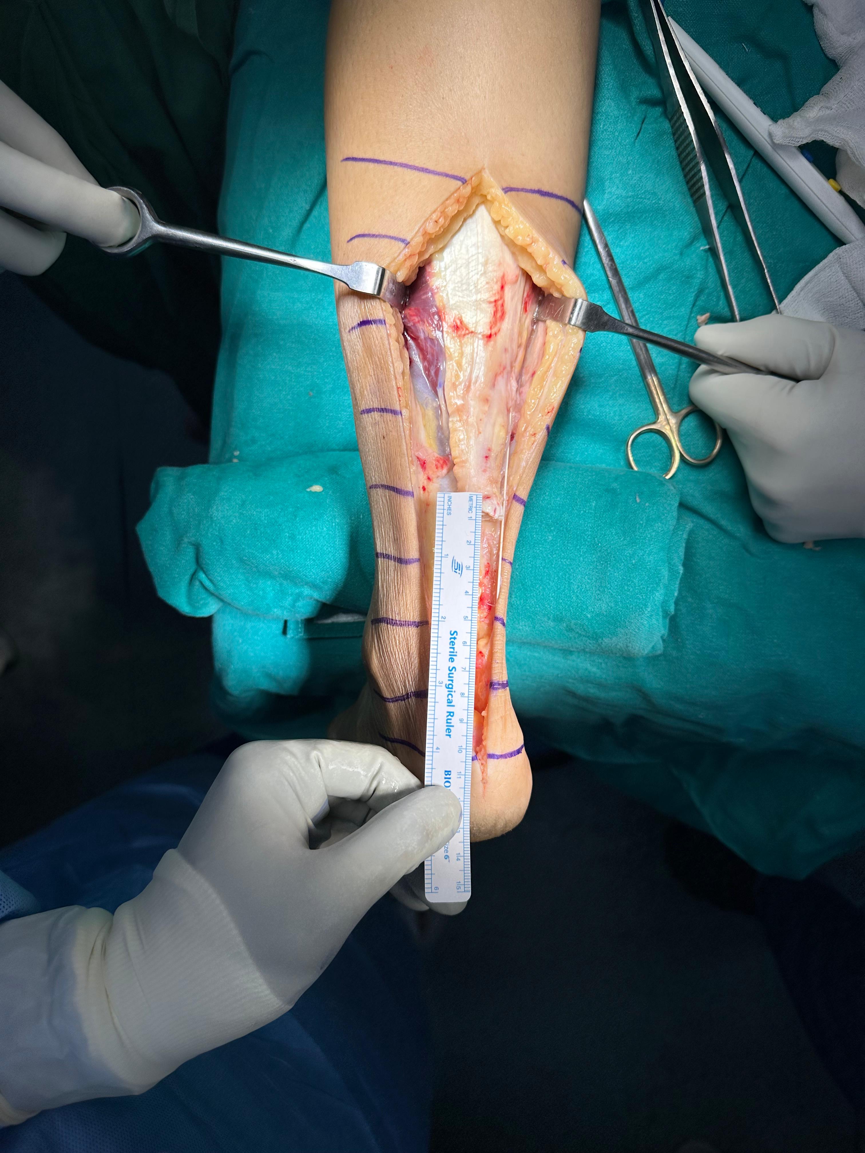 Intraoperative findings showed an extensive 11-cm tendon defect—far beyond the range where normal stitching can restore function. Injuries with such large gaps are uncommon and demand advanced reconstructive strategies to restore biomechanics and long-term function.