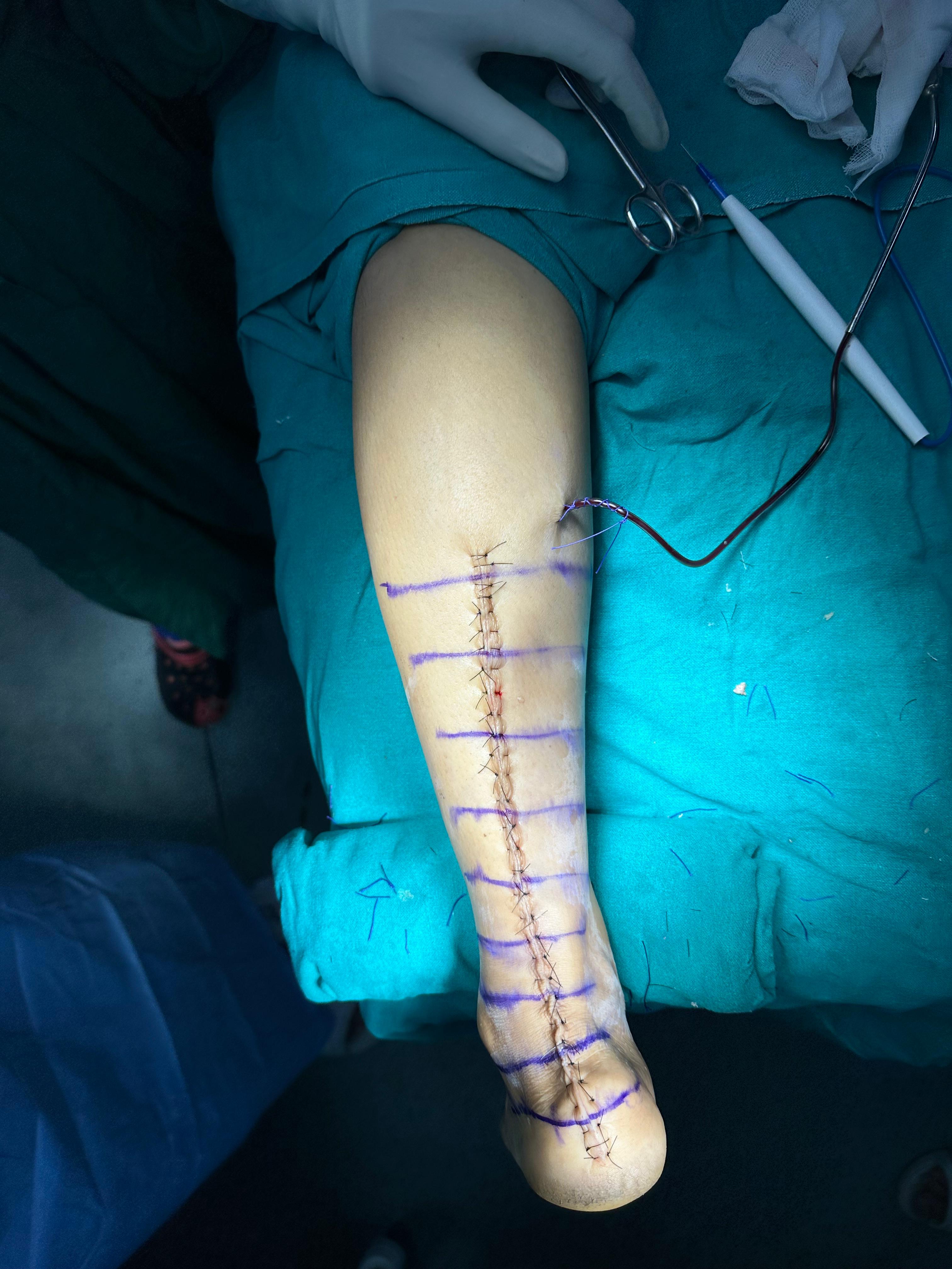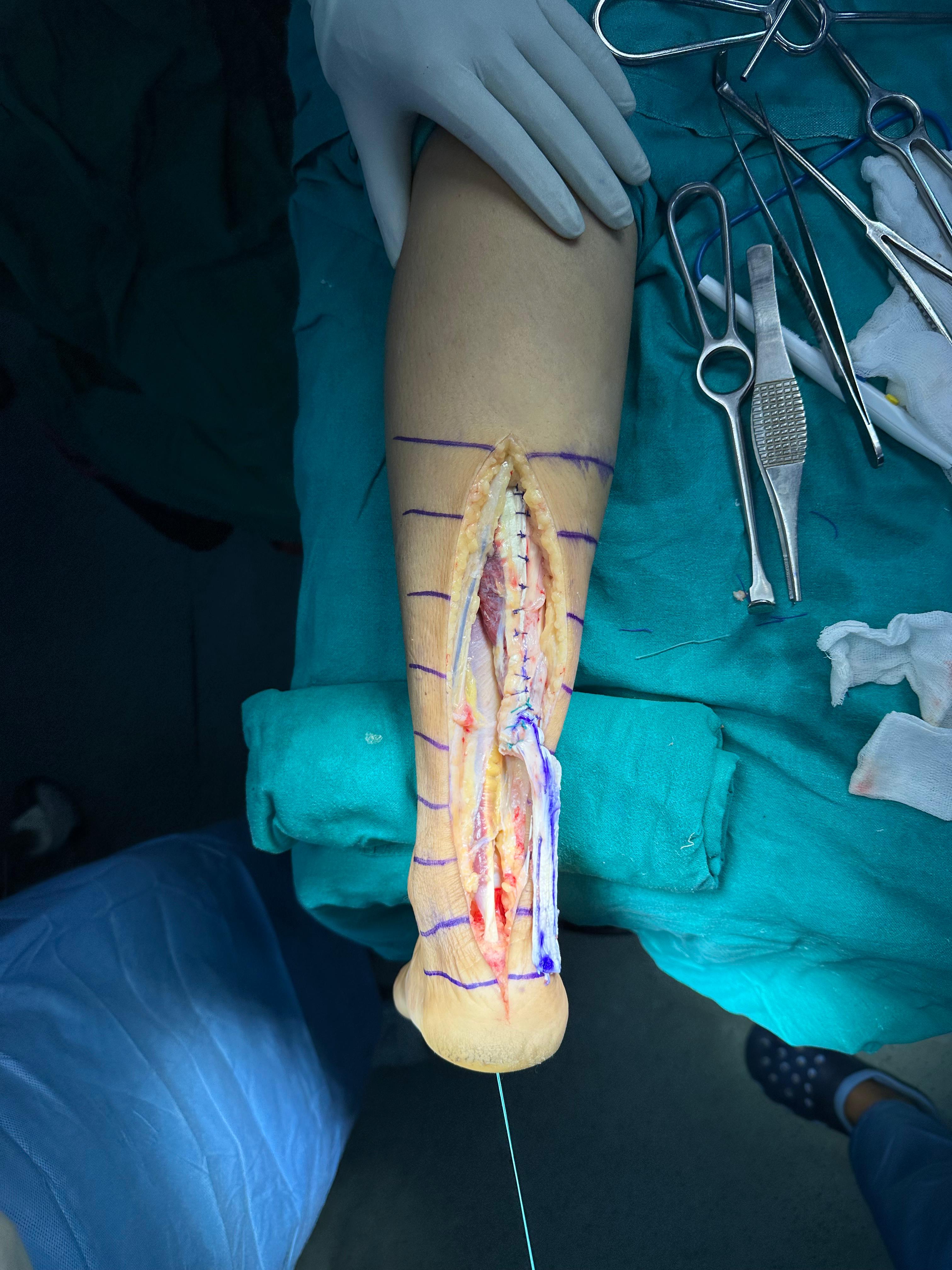 To reconstruct the tendon and restore strength, a Tongue Turn-Down Achilles Tendon Flap was performed. This technique involves fashioning a strong flap from the healthy part of the tendon and rotating it downward to bridge the gap.